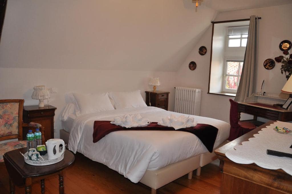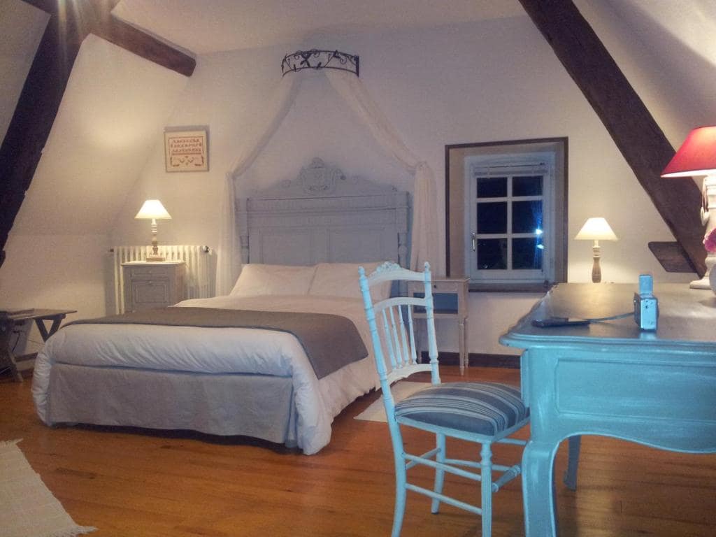 Très appréciée et pleine de charme, cette vaste chambre sous charpente ancienne est très confortable. Vue sur le jardin