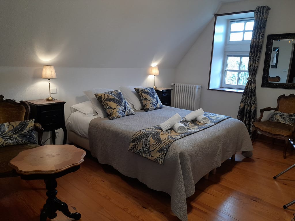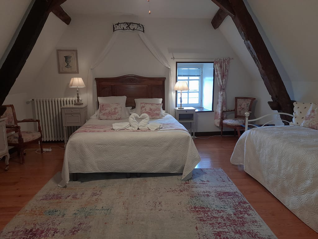 Très appréciée et pleine de charme, cette vaste chambre sous charpente ancienne est très confortable. Vue sur le jardin. Salle de bain avec baignoire balnéo et WC privé